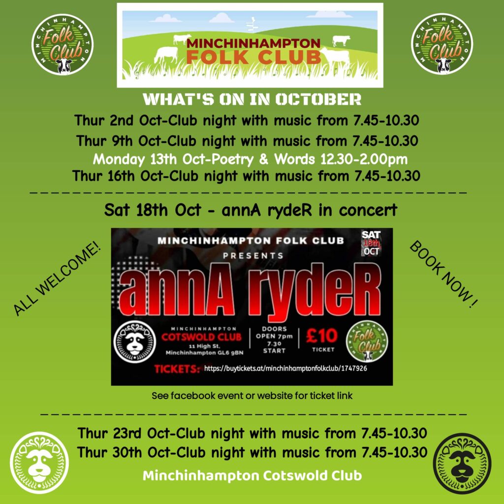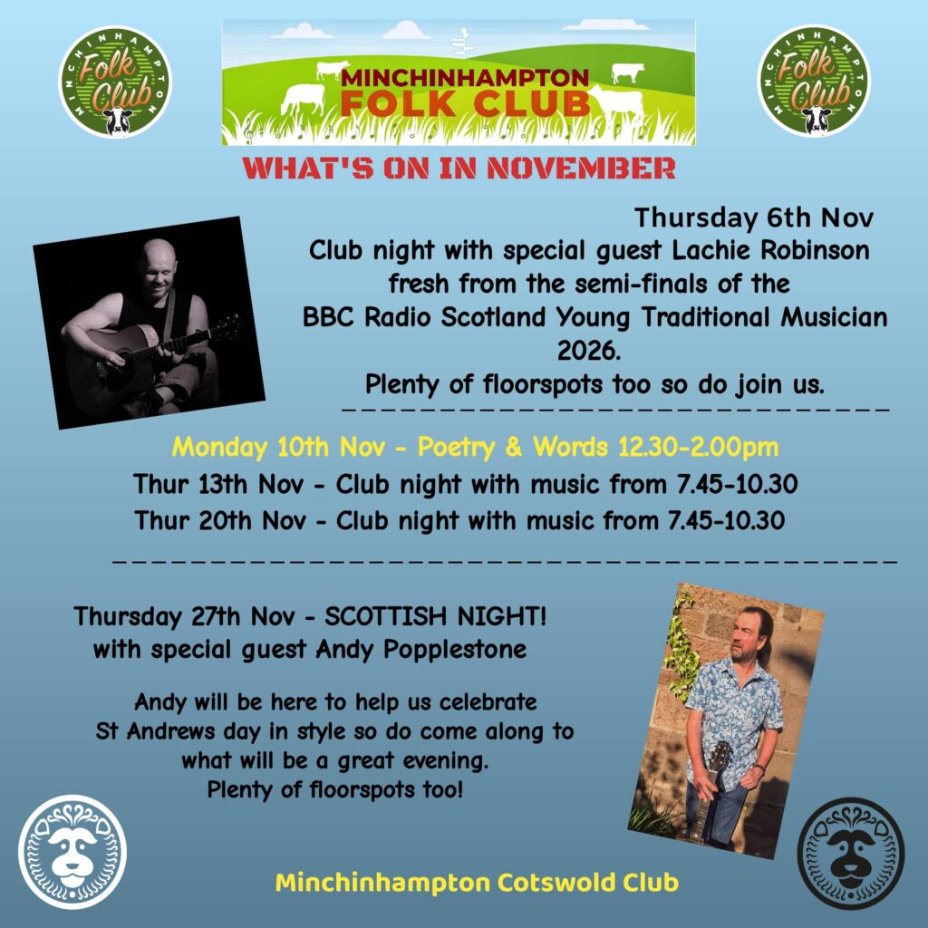 Music starts at 7.45 as usual. Plenty of floorspots. Members, guests performers and audience all welcome at the Minchinhampton Cotswold Club